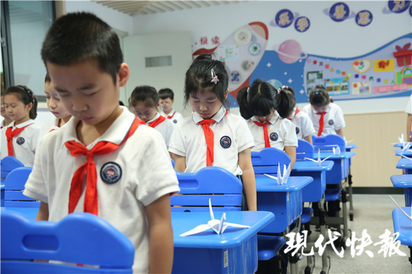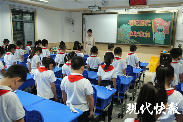 “特別提醒各位同學(xué),今天警報(bào)聲響起時(shí),請(qǐng)你放下手中的事,停下腳步,靜靜地站在原地默哀。”南師附小大隊(duì)輔導(dǎo)員胡穎告訴記者,希望每位同學(xué)銘記這個(gè)屈辱的日子,為戰(zhàn)爭(zhēng)中無(wú)數(shù)的英烈悼念、默哀,學(xué)校在每個(gè)班級(jí)門(mén)口都掛起了國(guó)旗,還在防空警報(bào)響起前開(kāi)設(shè)了一節(jié)晨會(huì)課,通過(guò)廣播的形式,告訴同學(xué)們九一八事變的這段歷史,希望他們珍愛(ài)和平、勤奮學(xué)習(xí)、嚴(yán)于律己、報(bào)效祖國(guó)。