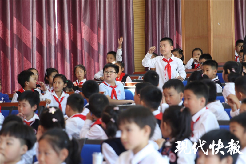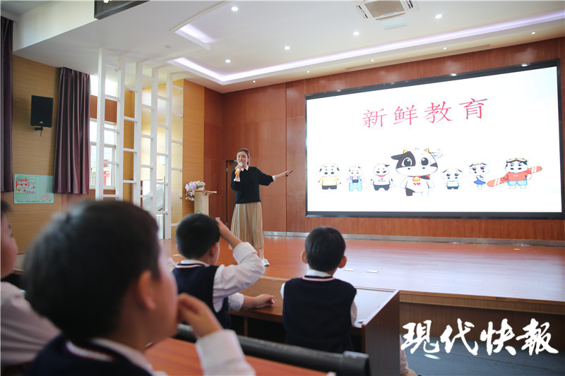 (記者 舒越/文 王玉秋晨/攝)10月9日,國慶8天假期結(jié)束后的第一天,位于明城墻腳下的南京市后標(biāo)營小學(xué)校園里十分熱鬧。“快看!秋晨哥哥來了!”“原來關(guān)于牛奶的知識(shí)有這么多呀……”當(dāng)天中午,現(xiàn)代快報(bào)小記者秋晨哥哥來到學(xué)校招新,同時(shí)“新鮮課堂”的小蔡老師也帶來了一場關(guān)于牛奶和飲食的小講座,一二年級近300名萌娃積極互動(dòng),還get了不少飲食小知識(shí)。