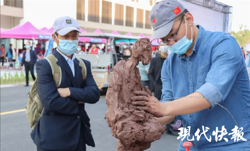 除了迎新禮物外,常大美術(shù)與設(shè)計學(xué)院的同學(xué)還迎來了進校來的第一次“現(xiàn)場教學(xué)”。“在展臺前現(xiàn)場做泥塑的是我們的一位大四學(xué)生,通過現(xiàn)場的美術(shù)創(chuàng)作讓新生更好地了解未來的學(xué)習(xí)狀況。同時我們還為來報到的新生準(zhǔn)備了現(xiàn)場速寫,能夠在這迎新的活動中留下一份難忘記憶。這邊展示的兩幅壁畫是我們學(xué)生的代表作。”學(xué)院朱睿老師解釋。