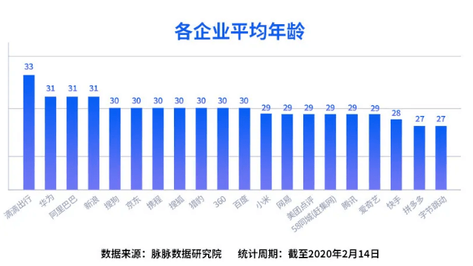 據(jù)脈脈數(shù)據(jù)研究院發(fā)布的《互聯(lián)網(wǎng)人才流動報告2020》 (以下簡稱“報告”),參與調(diào)研的19家互聯(lián)網(wǎng)企業(yè)的人才平均年齡為29.6歲,其中字節(jié)跳動和拼多多的員工平均年齡最低,僅為27歲;滴滴出行的員工平均年齡最高,但也在35歲以下。