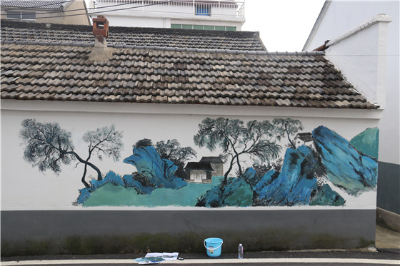 因天氣預(yù)報(bào)播報(bào)南京市7月份將連續(xù)陰天或有雨,為不影響繪畫效果,實(shí)踐團(tuán)只能將墻繪計(jì)劃提前。6月28日,大家一早到達(dá)了現(xiàn)場(chǎng),經(jīng)指導(dǎo)老師對(duì)墻繪步驟和技巧進(jìn)行詳細(xì)說明之后,大家便在組長(zhǎng)帶領(lǐng)下按照分工迅速進(jìn)入工作狀態(tài):調(diào)色、構(gòu)圖、描圖、修整、上色……學(xué)生們不畏烈日炎炎,縱使汗流浹背,也無一人喊苦喊累。在全體師生的共同努力與學(xué)院和村委的后勤保障之下,14面墻歷經(jīng)三天時(shí)間最終全部完工。在美院學(xué)子的畫筆之下,綿延群山、飛鳥野鶴、竹林荷花 ……“躍然墻上”,讓原本單調(diào)的白墻充滿了活力生機(jī)和詩(shī)情畫意。村民們看到后喜笑顏開,紛紛表示 “很漂亮”!