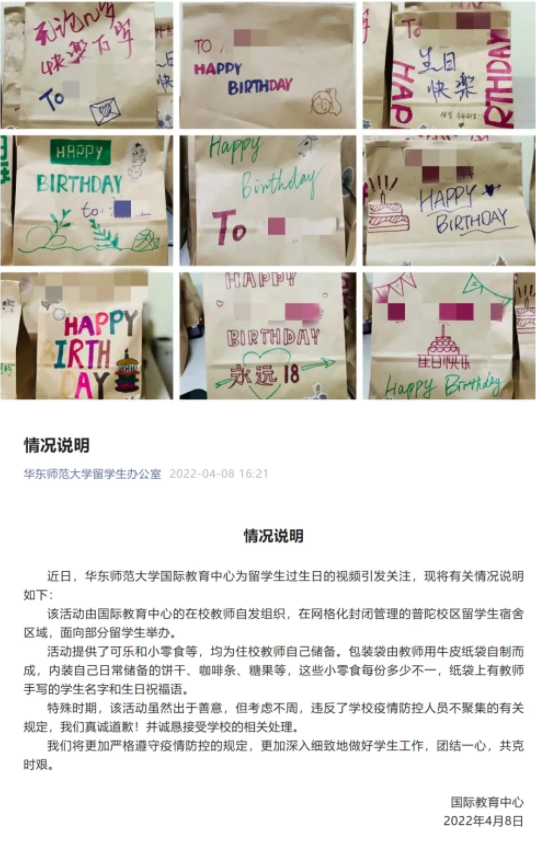 4月8日,華東師范大學(xué)國(guó)際教育中心發(fā)布《情況說明》稱,該活動(dòng)由國(guó)際教育中心的在校教師自發(fā)組織,在網(wǎng)格化封閉管理的普陀校區(qū)留學(xué)生宿舍區(qū)域,面向部分留學(xué)生舉辦。