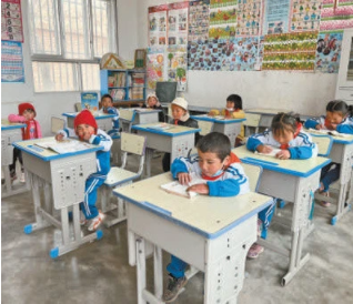 2017年,隨著易地扶貧搬遷政策的落實(shí),越來(lái)越多村民選擇搬到山腳開(kāi)始新的生活。學(xué)校里的孩子們由32名減少到9名。“9個(gè)孩子有7個(gè)是留守兒童,最大的8歲,最小的3歲。”完么仁增把黑板分成兩塊,左邊是一年級(jí),右邊是學(xué)前班,“安排了語(yǔ)文、數(shù)學(xué)、美術(shù)、道德與法治4門課,采用復(fù)式班的教學(xué)模式”。
