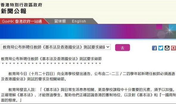據(jù)香港特別行政區(qū)政府網(wǎng)站消息,10月24日,香港特區(qū)政府教育局向全港學校發(fā)出通告,提出2023-2024學年起新任教師聘用必須通過《基本法》及《香港國安法》測試。有關(guān)要求適用于教師職系的所有職級,包括校長。