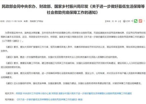 11月8日,民政部、中央農(nóng)村工作領(lǐng)導(dǎo)小組辦公室、財(cái)政部、國家鄉(xiāng)村振興局等四部門聯(lián)合印發(fā)的《關(guān)于進(jìn)一步做好最低生活保障等社會(huì)救助兜底保障工作的通知》(以下簡稱《通知》)全文公布。