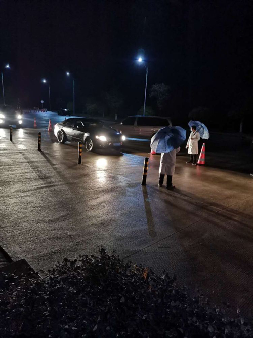 夜幕降臨,滾滾的車流燈光閃爍,忠信高速檢查站氣溫驟降至零攝氏度,令人瑟瑟發(fā)抖,額溫槍由于氣溫過低不時(shí)失靈,需要靠電加熱器烘烤才能恢復(fù)功能。監(jiān)測(cè)點(diǎn)前,兩排隔離墩圍成了一條體溫檢測(cè)通道,毛樣洪手持額溫槍站在通道邊緣,挨輛車詢問從哪里來,并細(xì)致地測(cè)量乘員體溫。