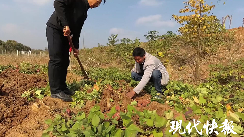 “陽光明媚,大好的天氣,歡迎到農(nóng)村,到美麗的神女湖體驗生活……”眼下正值山芋豐收的時節(jié),在陳福安的山芋地里,一幅熱火朝天的勞作場景吸引了現(xiàn)代快報記者的注意,人們正用釘耙刨地,挖出一個個山芋集中堆放。見到老陳時,他正一邊組織人力搶收山芋,一邊擺出專業(yè)的架勢,用手機(jī)進(jìn)行抖音直播,熱情地當(dāng)起了主播。“我們這些美女都挖了20多天的山芋了,她們很辛苦……”老陳直播時說著一口當(dāng)?shù)赝猎?,但是語言樸實,娓娓道來。