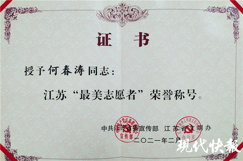 近日,中共江蘇省委宣傳部、江蘇省文明辦決定授予何春濤江蘇“最美志愿者”榮譽(yù)稱號。紅彤彤的證書拿在手上的那一刻,何春濤笑了:“老百姓需要我,我就一直做下去!”