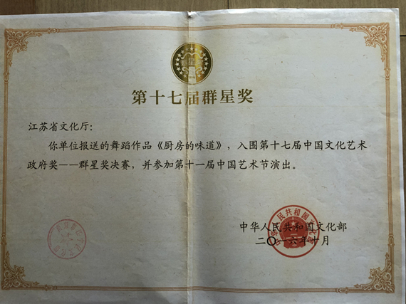 人們清楚地記得《手龍躍橫溪》這個舞蹈吧?說起它呢,還真有一段要好好說的故事呢。同行們都清楚地記得,當年創(chuàng)編這個舞蹈時也可謂是難度相當大。作為主創(chuàng)人員之一,田迪首先要考慮到手中的道具如何能運用好。因此,在舞蹈動作元素編創(chuàng)上,首先考慮提煉了古典舞中的一些身法,對手龍進行必要的改編。如加入的云手,腳下圓場、踏步翻身、點翻身、劃八字等身法,并在手持龍的基礎上進行動作,這無疑加大了舞蹈的難度,尤其是對于沒有舞蹈基礎的阿姨們來說,難度可想而知。特別是田迪和編導組設計的“八字甩龍”,就得讓演員腳下扎馬步,利用留頭甩頭和手臂的劃八字來完成,動作就像是龍在海浪中翻滾的感覺;“舉龍”則是運用單吸腿的動作,龍尾扣在腰間,左右上下高舉龍頭,表現(xiàn)龍從云中探出頭的感覺;“云手繞龍”則是將古典舞中云手帶入動作中,腳下為十字步,展現(xiàn)龍在空中盤旋的樣子,期間還要運用一些花鼓燈的元素。在“云手繞龍”和“龍珠戲龍”等環(huán)節(jié),除了動作的編排上既要考慮到精煉、必需\可承受,更多的還是要在上水平、上檔次上下功夫。對此,要想讓自己傾心編創(chuàng)的作品能帶來滿意的收效,別無選擇,田迪帶頭在八月的酷暑下指導、帶頭參加排練。整整一個“三伏”,既當“老師”、“陪練”、“示范”、“指導”的她,還要負責后勤保障、倒茶遞水、接送供飯……所吃的苦、所受的累,用當時主要負責這次創(chuàng)編工作的文化館負責人趙燕的話說,是“吃盡了苦頭,耗盡了精力,用盡了智慧,流干了汗水……”而最后回報田迪她們的是:圓滿完成了初賽和復賽兩次考驗,在全省展演和評比中,一舉拿下江蘇省五星工程獎金獎!