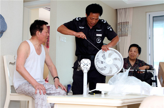 周良高幫助業(yè)主家老人安裝新購買來的電風(fēng)扇的情景