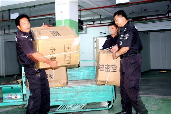 周良高(左1)帶領(lǐng)安保隊(duì)員在地下車庫為業(yè)主家中搬運(yùn)貨物