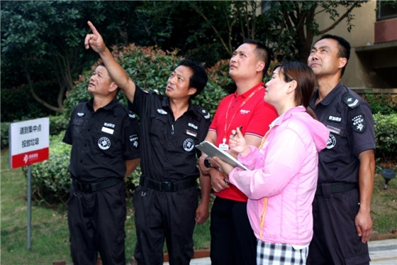 周良高(左2)與物業(yè)服務(wù)團(tuán)隊(duì)成員在園區(qū)檢查安全措施