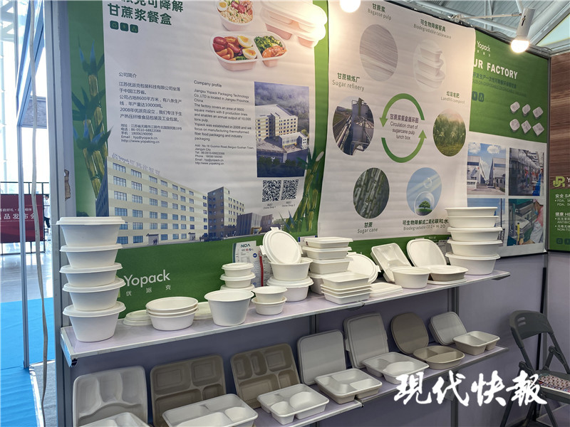 在今年的餐博會上,現(xiàn)代快報記者還看到不少一次性餐具生產企業(yè),無錫江陰的一家企業(yè)帶來不少可降解打包盒參展。“現(xiàn)在江蘇也出臺了升級版的限塑令,有了明確的時間表,餐飲企業(yè)還是很注意的,前來咨詢的也不少。”該展位銷售人員說,他們的產品是甘蔗漿為原料,大約90天就可降解,非常環(huán)保。“相比塑料餐盒成本會增加50%左右,但隨著限塑令升級,推廣可降解餐盒也是趨勢。”對方介紹,今年以來,他們明顯感覺國內訂單增加了不少。