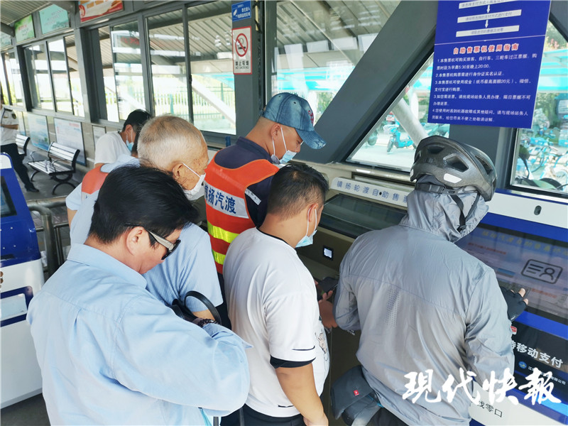 △鎮(zhèn)揚(yáng)汽渡的工作人員在指導(dǎo)旅客通過(guò)電子售票機(jī)購(gòu)票