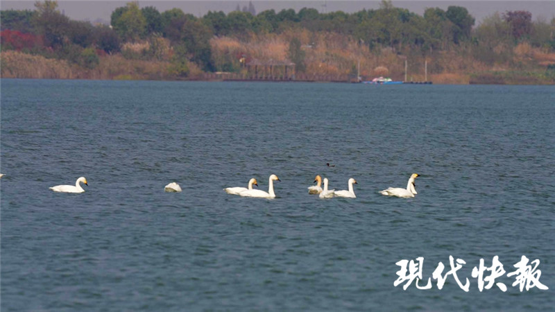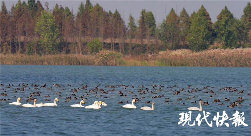 現(xiàn)代快報記者了解到,這是11月14日中午,句容赤山湖管委會工作人員王維拍攝到的一幕:只見湖面上棲息著數(shù)千只灰野鴨,而十幾只白天鵝則與它們在一起休憩嬉戲,畫面十分和諧溫馨。她告訴記者,當天,她們觀測到有11只小天鵝飛臨內(nèi)湖南堤觀鳥屋附近,與逗留在湖中心的4只小天鵝匯合,排成了一支長達5米的線性隊列,由湖的西南側(cè)向偏東方向緩慢游動。而湖里的數(shù)千只野鴨也似乎十分歡迎“新朋友”的到來。