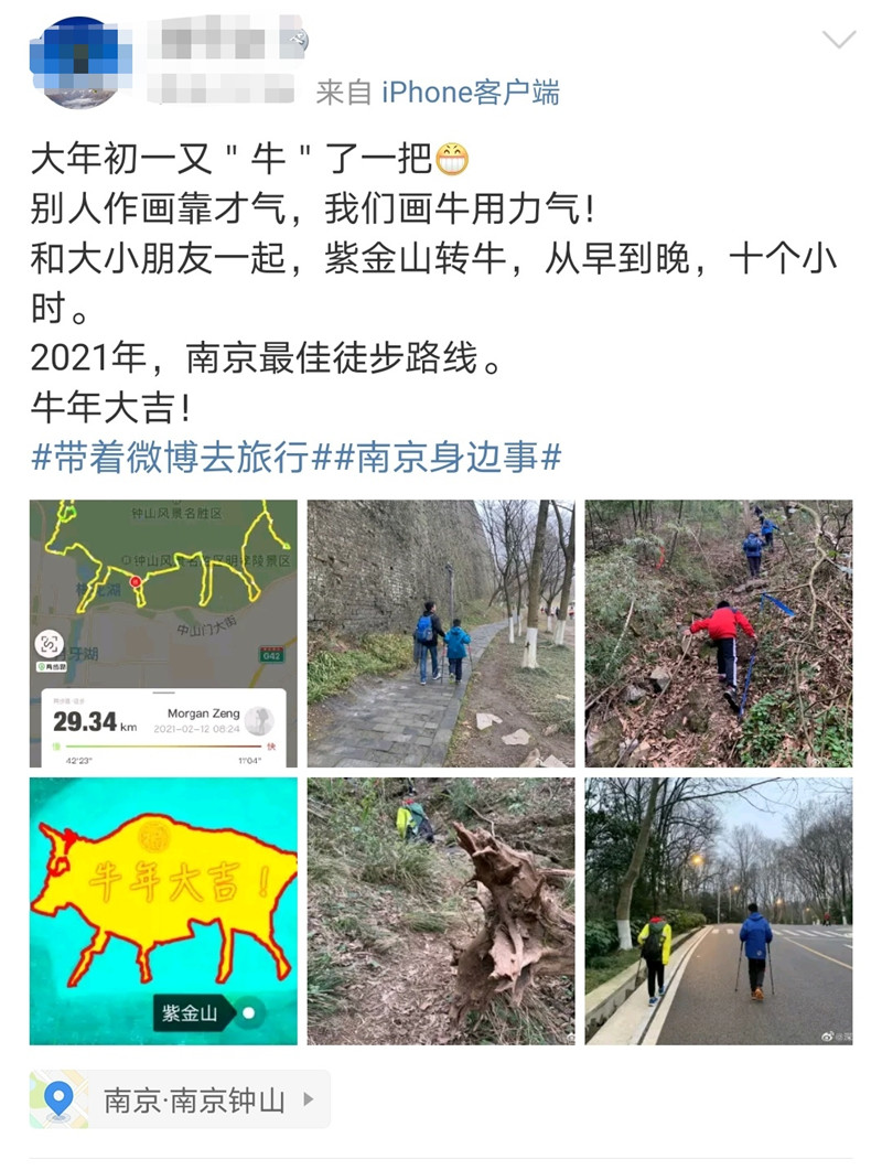 現(xiàn)代快報記者了解到,春節(jié)假期這幾天,幾乎每天都有不少市民參加徒步“畫牛”活動。微博用戶“@深寧之”曬出了大年初一成功“打卡”該活動的圖片,配文稱:“年初一又牛了一把。”“和大小朋友紫金山轉牛,從早到晚,十個小時。”