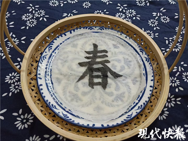 為了讓一家人的春節(jié)更有氛圍,陳正銀2月初就開始琢磨美食。“那天正好是立春,家里準(zhǔn)備了一些‘春’餅,我愛人在一旁寫毛筆字,我就突然來了靈感。”陳正銀想到,薄薄的“春餅”不就像宣紙嘛,宣紙上能寫字,在春餅上寫字會怎么樣?于是,他找來黑芝麻并磨成糊狀,在春餅上寫了個(gè)“春”字。“都說腹有詩書氣自華,把‘墨汁’吃到肚子里,新的一年也能收獲知識。”陳正銀很滿意這個(gè)作品。