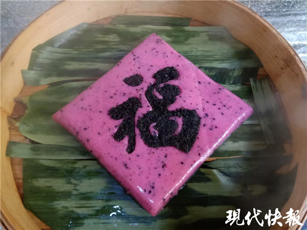有了“春”餅的啟發(fā),陳正銀又開始做“福”糕。在用火龍果和糯米做成的年糕上,陳正銀借助模具用黑芝麻寫了一個(gè)“福”字。“我們中國過年最喜歡的字就是福,這個(gè)寫有福字的年糕,可以把福氣吃進(jìn)肚子里。”陳正銀說,為了保證福字上鍋蒸后仍不變形,火候和時(shí)間的把握很關(guān)鍵,需要多嘗試才能掌握技巧。
