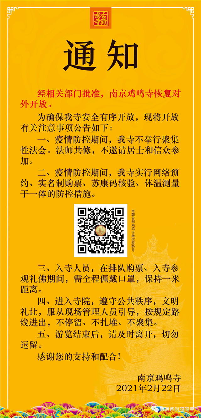 (記者 李鳴)2月22日,現(xiàn)代快報記者了解到,經(jīng)相關部門批準,雞鳴寺將于2月23日恢復對外開放。