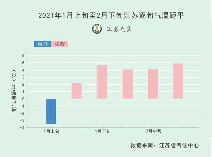 今年的花期為何紛紛提前呢?近日,中國氣象局國家氣候中心表示,2020年12月1日至2021年2月28日的冬季為暖冬。2021年1月1日至2月28日,江蘇全省平均氣溫5.7℃,較常年同期偏高2.7℃。其中,2月平均氣溫(8.5℃)為1961年以來歷史同期最高值。從逐旬氣溫距平來看,1月上旬之后氣溫一直偏高,尤其是1月下旬之后均偏高4℃以上。