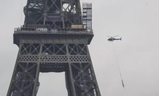 游客們?cè)谔亓_卡德羅(Trocadero)廣場(chǎng)上觀看了新的數(shù)字無線電天線被直升機(jī)吊起的過程。