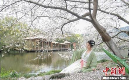 漢服愛好者在西湖花港公園櫻花樹下拍攝。(王剛 攝)