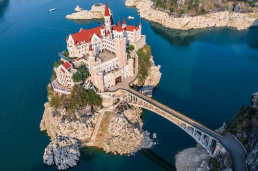 通過無人機(jī)航拍可以看到這座城堡的全貌,它建在萬峰湖的一座孤島上,四面環(huán)水,僅有一座拱橋連接著湖岸,供人們進(jìn)出城堡。