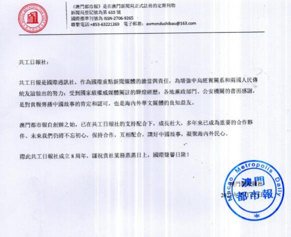 澳門都市報(bào)社致信祝賀共工日?qǐng)?bào)社建社8周年