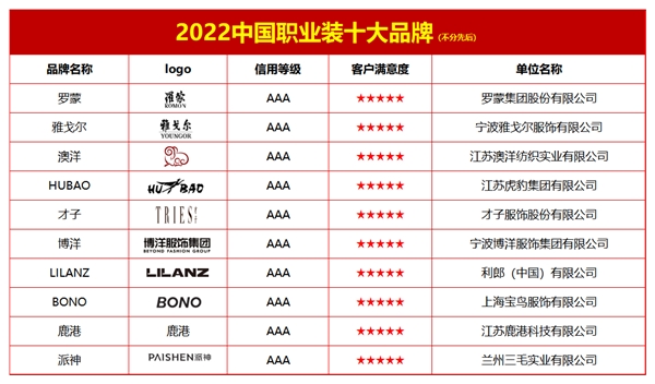 隨著時代的發(fā)展,職業(yè)裝不再只是簡單的制服,需求逐漸向“品質(zhì)、時尚、舒適、健康”方向轉(zhuǎn)變,需要體現(xiàn)單位企業(yè)、品牌的文化和特色,更要滿足個性化、定制化需求,從材質(zhì)的選擇到款式的設(shè)計,職業(yè)裝逐漸呈現(xiàn)出多樣化、工藝化、綠色環(huán)保等多重需求。職業(yè)裝招投標市場發(fā)展迅速,市場規(guī)模不斷擴大,競爭日益激烈,職業(yè)裝品牌化發(fā)展成為企業(yè)贏得訂單和客戶信任的關(guān)鍵,品牌化發(fā)展可以幫助企業(yè)提升品質(zhì)和品牌形象,擴大市場份額,提高產(chǎn)品附加值,推動產(chǎn)品與服務(wù)升級,形成品牌認同和信賴,提高用戶對產(chǎn)品的價值認可度。“2022中國職業(yè)裝十大品牌”榜單權(quán)威發(fā)布旨為推動我國服裝行業(yè)高質(zhì)量可持續(xù)發(fā)展進程,促進更多服裝企業(yè)加強自主品牌建設(shè)和產(chǎn)品優(yōu)化,提升品牌在招投標市場的知名度、美譽度和影響力,樹立“中國品牌”標桿,發(fā)揮品牌引領(lǐng)帶動作用,為廣大招標采購單位需求方、代理加盟商、經(jīng)銷商及社會各界提供重要驗證參考。具體如下: