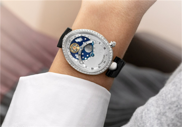 寶璣Reine de Naples那不勒斯王后系列8998晝夜顯示腕表,傾情描繪太陽(yáng)與月亮之間若即若離的渴慕,在表盤上驛動(dòng)起美輪美奐的光陰之舞。為此,寶璣研制出專利技術(shù)機(jī)芯,布局出雙表盤顯示,一個(gè)以傳統(tǒng)方式顯示時(shí)分,第二個(gè)顯示日夜時(shí)間復(fù)雜功能。為了呈現(xiàn)出日月臨空的奇幻景象,寶璣選用青金石盤代表藍(lán)天,藍(lán)天上嵌入天然珍珠母貝的白云、金質(zhì)的星星、以及手工鐫刻的鈦金屬月亮圖案。然而,這片天空中的巨星當(dāng)屬照耀萬(wàn)物的太陽(yáng),平衡擺輪外圈切割面的反射如同太陽(yáng)的縷縷金光。夜晚觀時(shí),月亮懸于太陽(yáng)之上,宛如一輪明月高掛。伴隨平衡擺輪運(yùn)作,一整天,陽(yáng)光從鋼制表橋間穿透而過(guò),投射在時(shí)分針上,而當(dāng)與鈦金月亮面對(duì)面時(shí),太陽(yáng)的光輝達(dá)到頂點(diǎn),好似在傳達(dá)愛意,而月亮也報(bào)以溫柔回望。