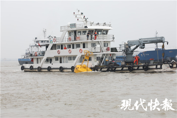 長航公安局南京分局儀征派出所水上巡邏艇在現(xiàn)場拉起警笛,同時通過喊話提醒過往船舶避讓。隨后,接到消息的南京航道部門南京寧道標(biāo)403船舶也趕到現(xiàn)場,將儀化2號錨浮標(biāo)筒固定在船舶旁,拖回長江儀征取水口水域進(jìn)行固定,并將斷裂的纜繩連接上,消除了隱患。