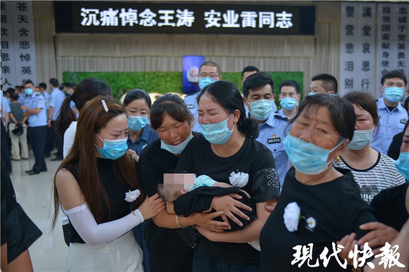王濤的妻子葉鳴牽著5歲的女兒、安業(yè)雷的妻子趙麗娟抱著兩個月的女兒來到現(xiàn)場,讓人無不為之動容。5歲的女兒尚不知事,只是不停地盯著爸爸的照片看。