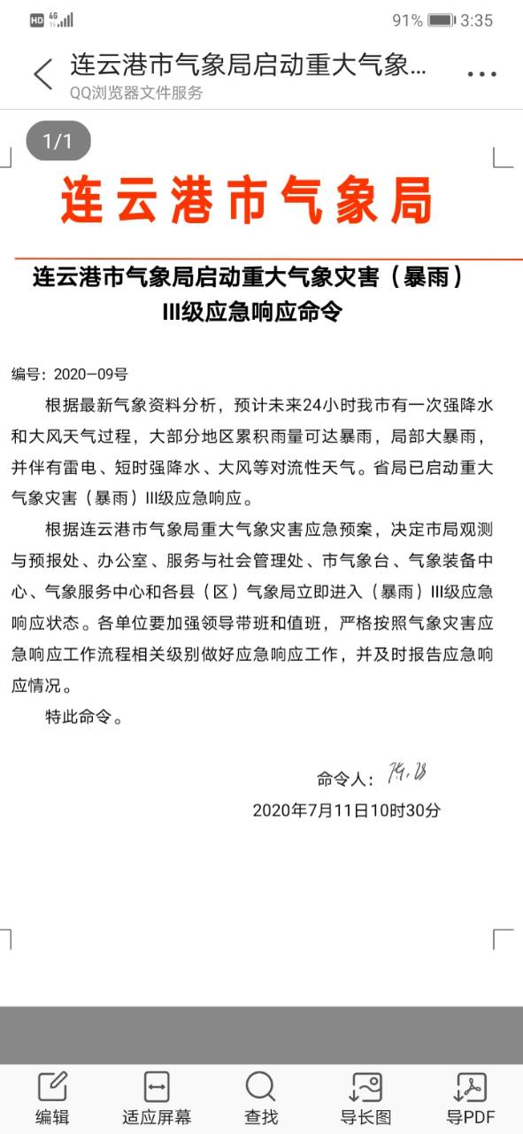 命令稱,根據(jù)最新氣象資料分析,預(yù)計(jì)未來(lái)24小時(shí)連云港市有一次強(qiáng)降水和大風(fēng)天氣過(guò)程,大部分地區(qū)累積雨量可達(dá)暴雨,局部大暴雨,并伴有雷電、短時(shí)強(qiáng)降水、大風(fēng)等對(duì)流性天氣。江蘇省氣象省局已啟動(dòng)重大氣象災(zāi)害(暴雨)Ⅲ級(jí)響應(yīng)。根據(jù)連云港市氣象局重大氣象災(zāi)害應(yīng)急預(yù)案,決定連云港市氣象局觀測(cè)與預(yù)報(bào)處、辦公室、服務(wù)與社會(huì)管理處、連云港市氣象臺(tái)、氣象裝備中心、氣象服務(wù)中心和各縣(區(qū))氣象局立即進(jìn)入(暴雨)Ⅲ級(jí)應(yīng)急響應(yīng)狀態(tài)。