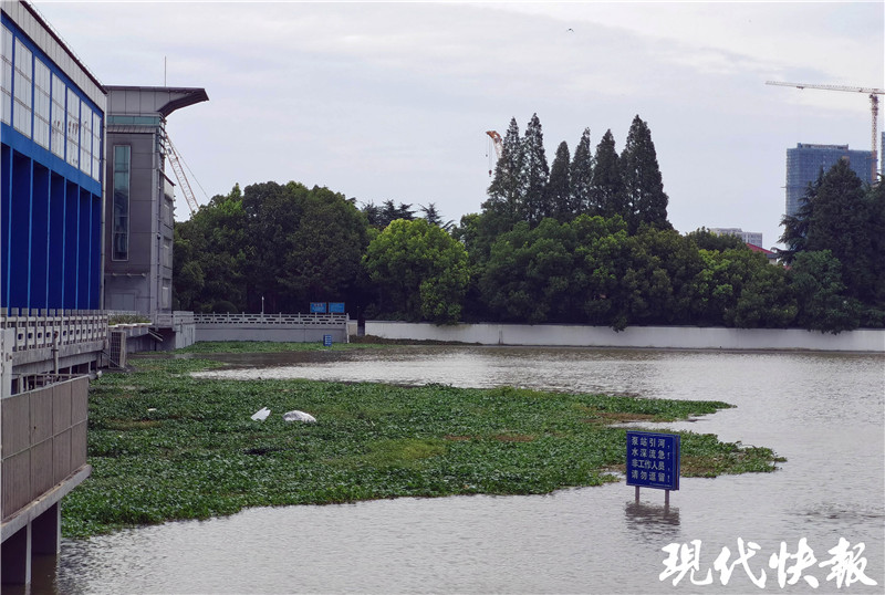 隨后,記者來到秦淮新河閘內(nèi)側(cè),河水同樣淹沒了大部分護坡,靠近閘的地方還漂浮了許多綠色的水生植物,比如水葫蘆。這些植物是從秦淮河上游飄過來的,為什么不進行打撈?據(jù)了解,由于秦淮河水位不斷上漲,為緩解城市內(nèi)澇,7月7日起開啟秦淮新河泵站,站內(nèi)的5臺臥式軸流泵機組全部打開,排澇流量為50m³/s。“因此,即便水面看上去很平靜,水下正在將流域澇水向外排,而這時打撈雜草是非常危險的。”薛海朋說。