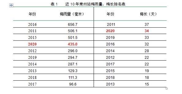 △近十年常州站梅雨量、梅長排名表