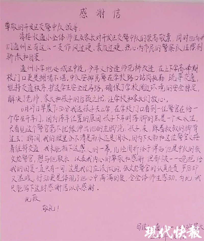 現(xiàn)代快報(bào)記者了解到,寫下感謝信的衛(wèi)女士,是通州小學(xué)一年級學(xué)生的家長。這所小學(xué)位于城區(qū)中部,上下學(xué)高峰期時人流量較大,每天都有護(hù)學(xué)崗的民警在現(xiàn)場執(zhí)勤維持秩序。