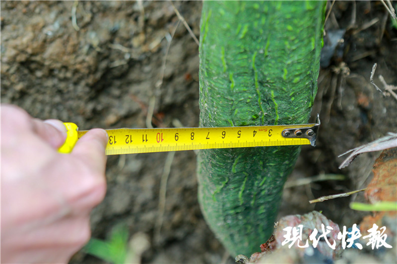 這根絲瓜瓜柄處直徑為2公分,最粗處達(dá)8公分。“種了7年桃子地,桃園里還是頭一次長(zhǎng)出這么長(zhǎng)的絲瓜。”桃園主人陳棟健告訴記者,這根“絲瓜大王”長(zhǎng)速驚人,“前一周還是測(cè)量還是1.95米。今天已經(jīng)長(zhǎng)到2.17米了,真的和現(xiàn)役國(guó)家隊(duì)中鋒周琦一樣高了。”