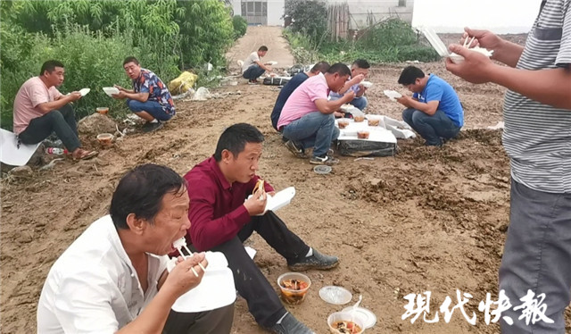 7月22日中午,現(xiàn)代快報記者來到大堤,經(jīng)過一夜的搶險工作,堤上部分搶險人員正躺在泥濘的地上休息,這是他們20多小時以來第一次躺下合眼。下午2時,他們匆匆吃了飯,休息片刻又投入了加固大堤的作業(yè)中。