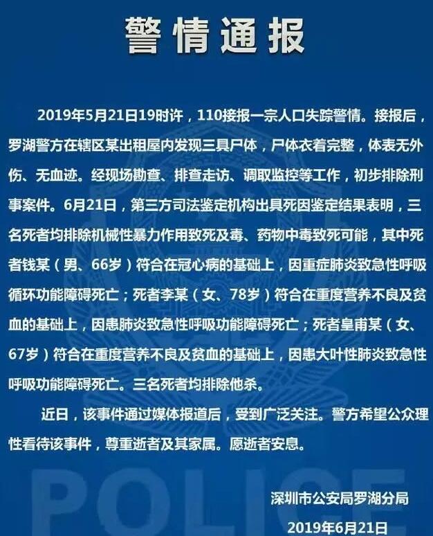 同年6月21日,羅湖警方發(fā)了一則警情通報(bào)稱,錢先生的父親符合在冠心病基礎(chǔ)上,因重癥肺炎致急性呼吸循環(huán)功能障礙死亡;錢先生的母親符合在重度營(yíng)養(yǎng)不良及貧血的基礎(chǔ)上,因患大葉性肺炎致急性呼吸功能障礙死亡;錢先生的堂伯母符合在重度營(yíng)養(yǎng)不良及貧血的基礎(chǔ)上,因患肺炎致急性呼吸功能障礙死亡。三名死者均排除他殺。