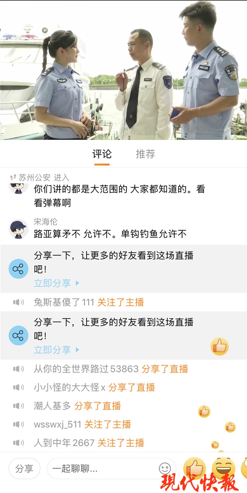8月4日,江蘇省公安廳新聞宣傳中心、蘇州市公安局新聞宣傳中心聯(lián)合開啟直擊長(zhǎng)江禁捕第一線直播。直播中請(qǐng)來了一名嘉賓,他就是蘇州市公安局水警支隊(duì)民警許冬。他為大家解答了相關(guān)政策法規(guī)、禁捕水域范圍、“三無船舶”查處等相關(guān)熱門問題。