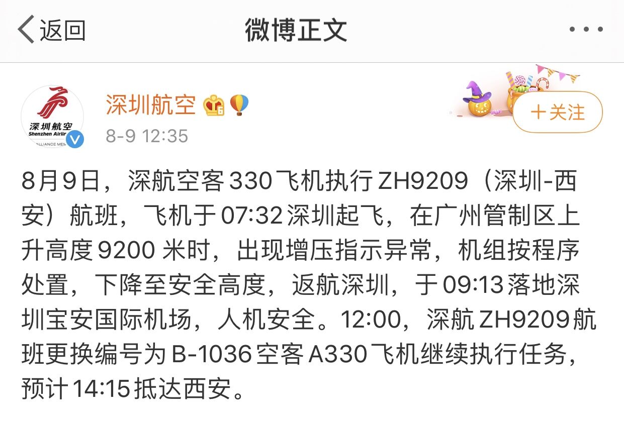 回歸返航事件本身,當(dāng)天12:35,深圳航空官方通報(bào)稱:8月9日,深航空客330飛機(jī)執(zhí)行ZH9209(深圳—西安)航班,飛機(jī)于07:32深圳起飛,在廣州管制區(qū)上升高度9200米時(shí),出現(xiàn)增壓指示異常,機(jī)組按程序處置,下降至安全高度,返航深圳,于09:13落地深圳寶安國(guó)際機(jī)場(chǎng),人機(jī)安全。12:00,深航ZH9209航班更換編號(hào)為B-1036空客A330飛機(jī)繼續(xù)執(zhí)行任務(wù),預(yù)計(jì)14:15抵達(dá)西安。