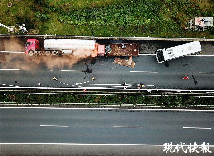 8月11日,由江蘇省公安廳、江蘇省交通運(yùn)輸廳、江蘇交通控股有限公司聯(lián)合主辦的2020年高速公路省際聯(lián)動應(yīng)急預(yù)案演練,在S49新?lián)P高速揚(yáng)州段開演。應(yīng)用無人機(jī)、信息監(jiān)管平臺查詢,再加上江蘇高速“智慧大腦”指揮,1小時左右就將這個“危險(xiǎn)事故”化于無形。
