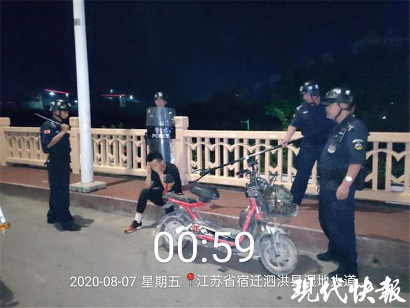 據(jù)警方介紹,事發(fā)時間為8月7日凌晨,當時,宿遷市泗洪縣公安局巡特警隊員們正和往常一樣在重點路段開展街面巡邏工作。“結(jié)果在泗州大橋上就看到遠處有個男的鬼鬼祟祟,他剛偷了一輛電動車。”其中一名巡特警隊員介紹,這名男子當時眼神閃躲、四下張望,車上也沒有插鑰匙,而且在看到這幾位巡特警隊員時,他的表情明顯變得很不自然。