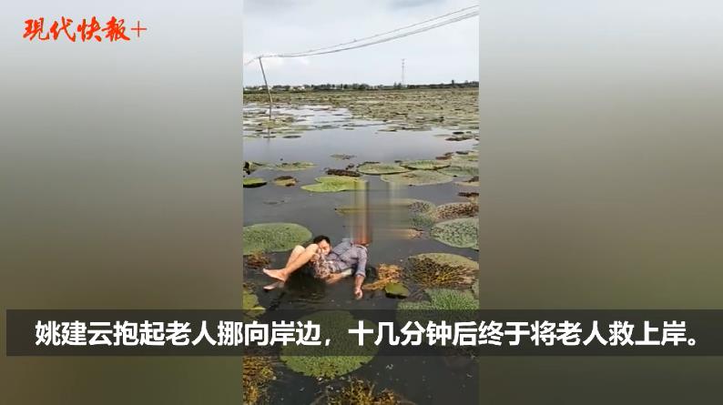 姚建云、顧軍迅速?zèng)_到芡實(shí)塘邊,果然發(fā)現(xiàn)一名老人落水,“當(dāng)時(shí)情況非常危險(xiǎn),老人只剩頭部在水面以上。”姚建云毫不猶豫跳進(jìn)水中進(jìn)行營(yíng)救。由于連日的強(qiáng)降雨,此時(shí)千畝芡實(shí)大塘顯得格外泥濘,姚建云不顧自身可能陷入淤泥中的危險(xiǎn),一邊安慰老人,提醒老人千萬(wàn)不能亂動(dòng),一邊慢慢地挪向老人。抓住老人以后,姚建云抱起老人一步一步挪向岸邊,經(jīng)過(guò)緊張的十幾分鐘,終于將老人營(yíng)救上岸。