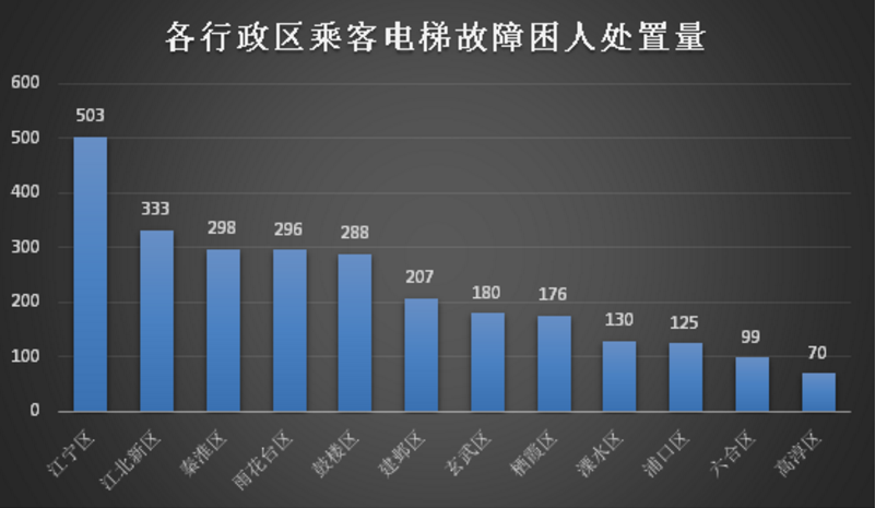 從各區(qū)來看,上半年乘客電梯故障困人發(fā)生次數(shù)最多的是江寧區(qū),共503起。專家分析,主要是因?yàn)榻瓕巺^(qū)是電梯總量多、住宅電梯多、老舊電梯多的區(qū)之一。江寧區(qū)泰西路28號泰來苑83棟1單元同一電梯上半年發(fā)生6起困人故障,為全市最多。