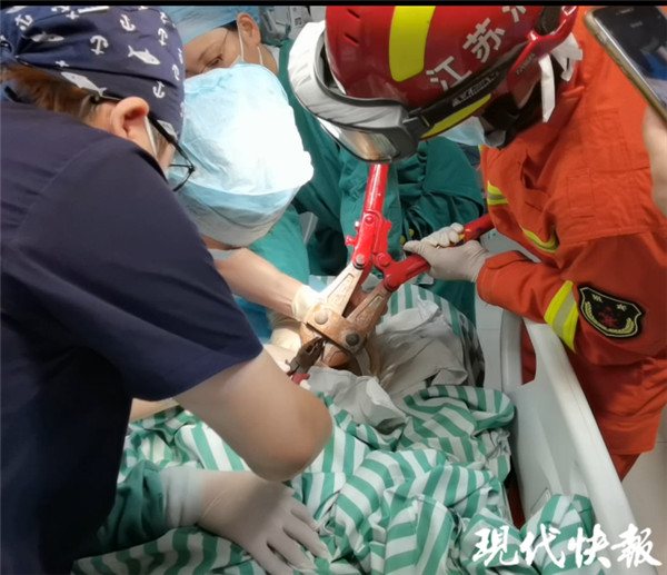 在醫(yī)護(hù)人員和消防員合作下,消防員拿起大力剪,只聽見“咔嚓”一聲,修腳刀被剪斷,幼兒被送往手術(shù)室進(jìn)行手術(shù)。目前,幼兒還在進(jìn)一步治療中。