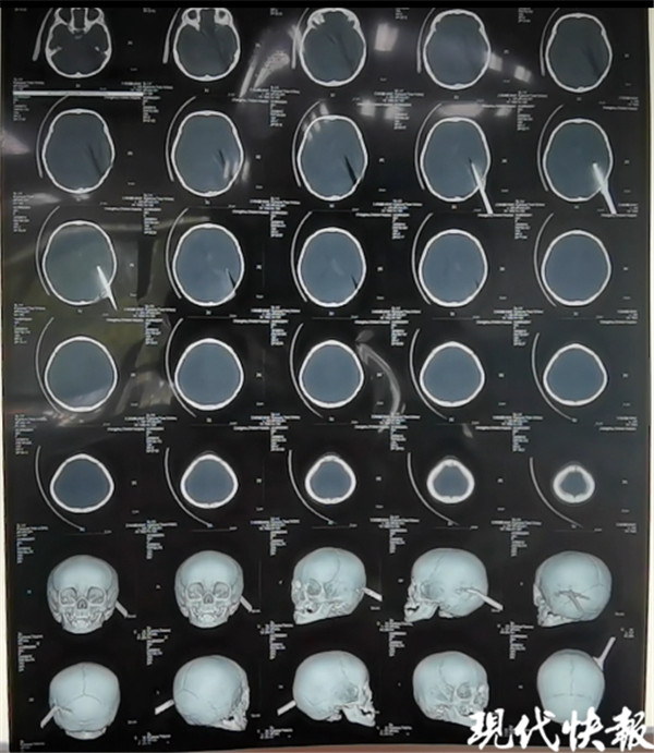 只見急救室的病床上,幼兒的頭發(fā)已經(jīng)被剃光,一把修腳刀赫然插入頭部左后側(cè),裸露在外的部分大約有十來公分長。而從CT影像圖來看,插入頭部的部分也有三四公分長。醫(yī)務(wù)人員希望救援人員將裸露在頭部外的修腳刀切斷,但由于位置的特殊性,不能采用電動切割裝置,只能用大力鉗小心翼翼地進(jìn)行剪切。