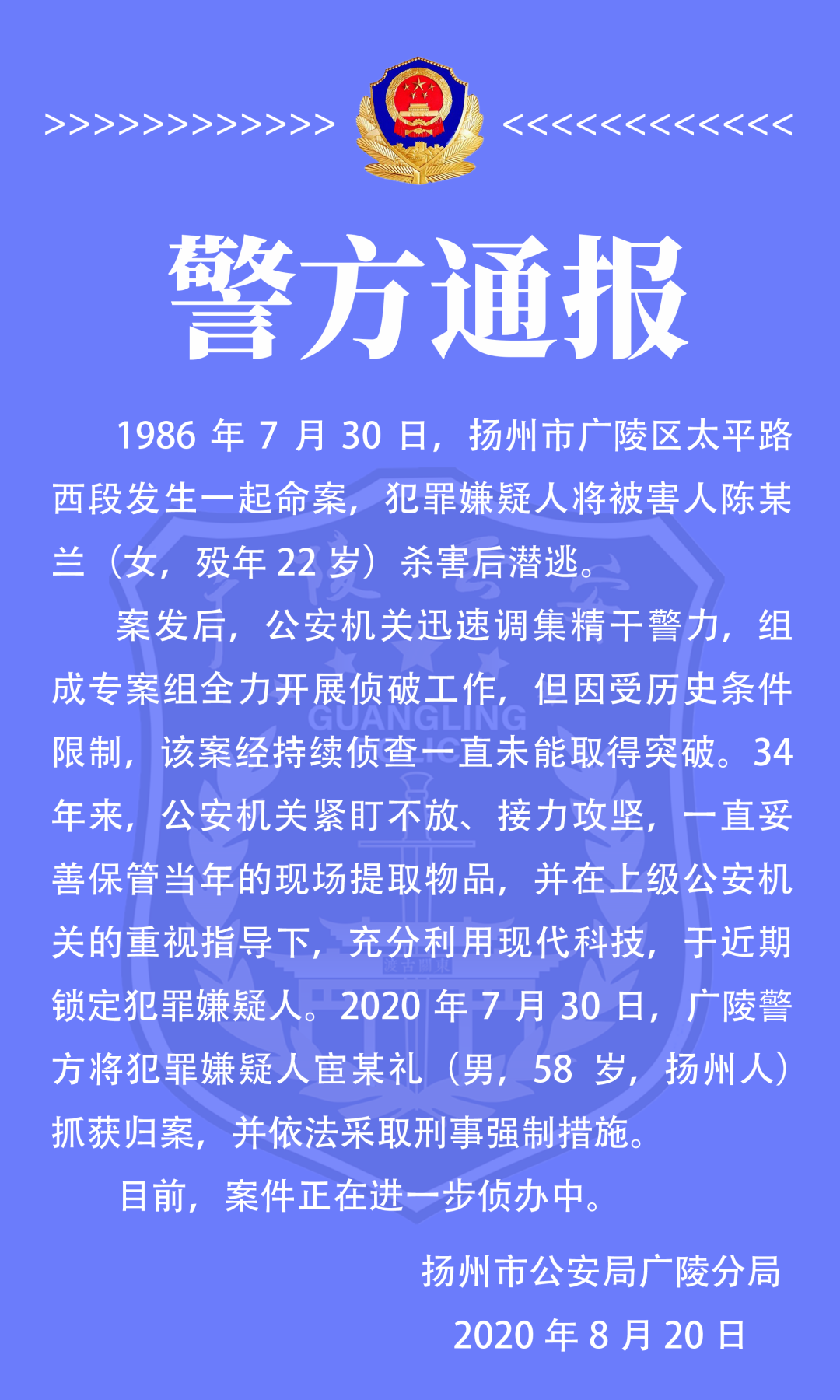 (記者 顧瀟)8月20日下午,揚州廣陵警方發(fā)布公告,偵破一起1986年的命案,受害女子被害時年僅22歲。犯罪嫌疑人宦某禮,在作案34年后的同一天被警方抓獲歸案。