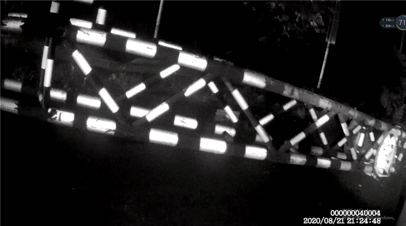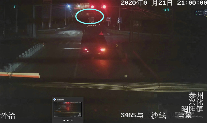 8月21日晚,在周奮加油站前的紅綠燈處,來(lái)往車輛正在有序通行。從路邊公共視頻探頭可以看到,在紅綠燈東側(cè)路口,為了限制貨車通行,設(shè)置了一個(gè)限高龍門(mén)架。