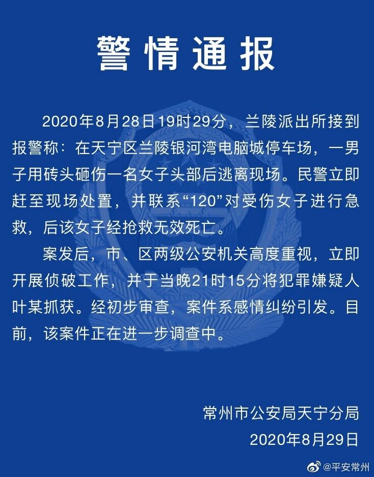 常州警方表示,經(jīng)初步審查,該案件系感情糾紛引發(fā)。目前,該案件正在進(jìn)一步調(diào)查中。